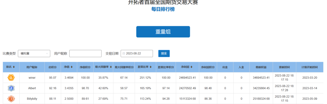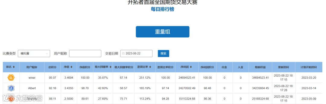 虽然前三名领先较多,但是近期期货市场行情大好,一天翻倍真不是梦,排名靠后的朋友们,请让我见证你的奇迹!