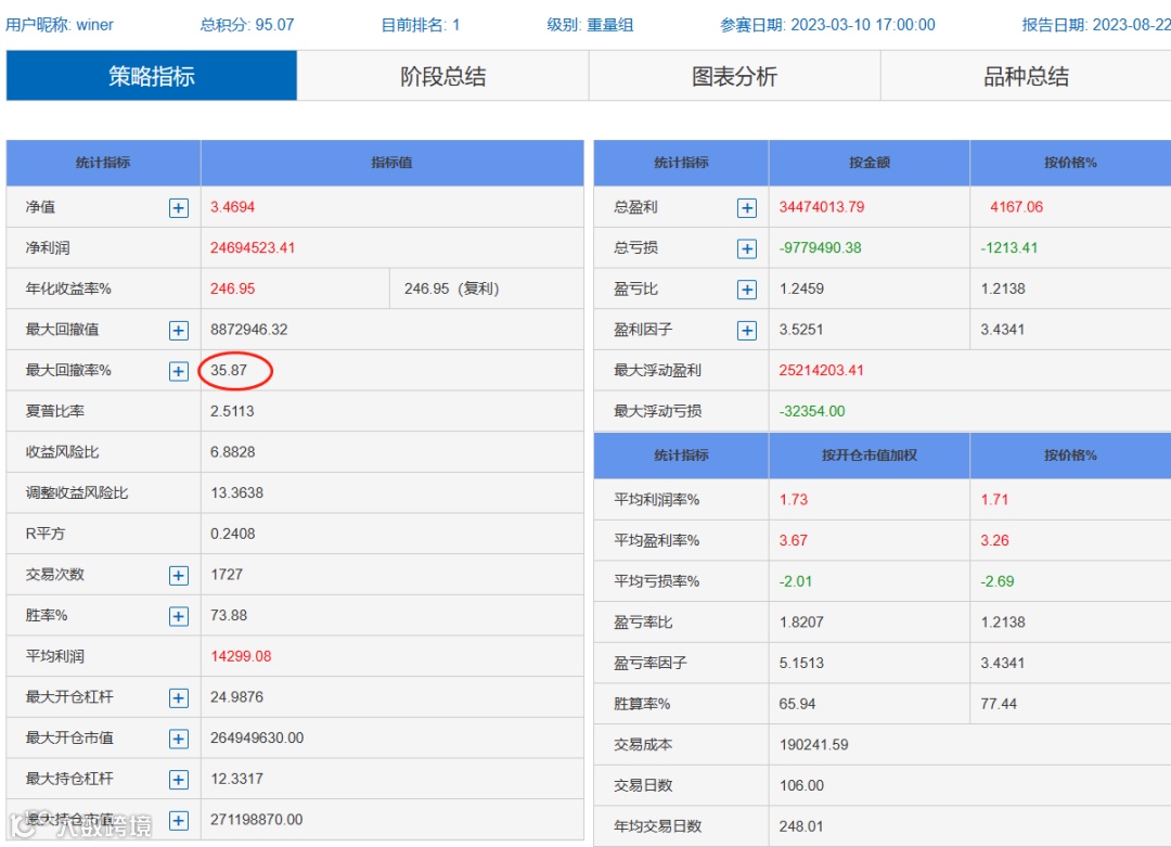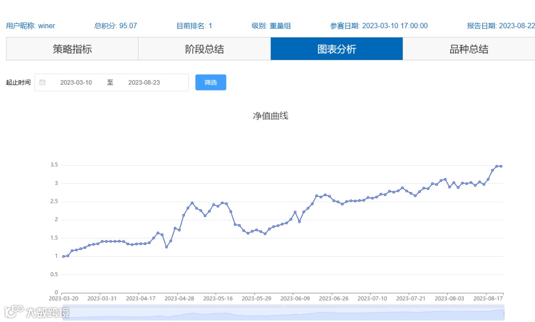 我们看到最新的模拟大赛排名,目前第一winer与第二名Albert展开了激烈的“战斗”,目前他们净值都在3.4以上,与第三名billybilly已经开了较大距离。