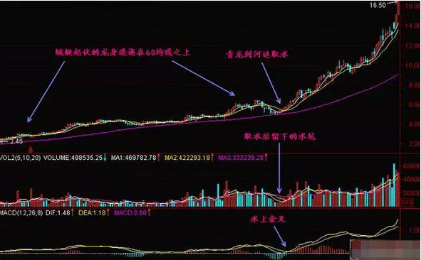 5日、10日和60日线图上,5/10日线不断上下起伏,形如龙躯。日K线依附在龙体上像龙鳞一般,持续周期可达半年之久,青龙取水后得到拉升的筹码,股价持续暴涨。