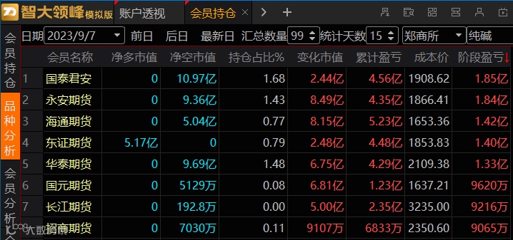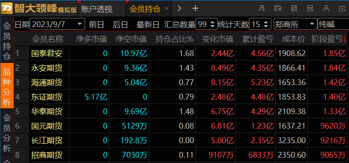 1、国泰君安,这个席位在年初的时候短期大赚过一笔,一直拿着多单的净持仓,在4月份开始做多翻空,利润又开始回升,但随着纯碱价格回升,它的空单又开始亏钱,直到八月份开始就空翻多,近期调仓比较频繁,但节奏都踏对了。这个席位就像芜湖上将里的赵子龙,高打高举,七进七出。
