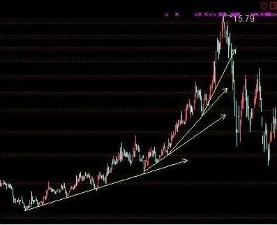 价格有时候会加速发展而脱离原来的趋势线。你可以绘制一条比较陡峭的新趋势线。它显示趋势正在加速发展,持续的能力将降低。当趋势加速发展时,必须紧缩止损点,将它设定在新趋势线外侧的边缘,并根据每支新线形进行调整。一旦价格突破新趋势线,通常会发生急速的反转。