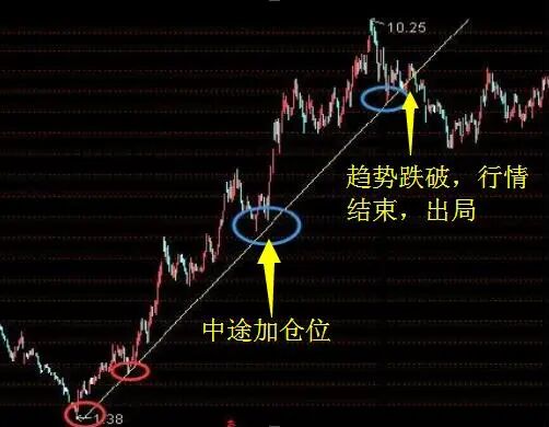 当趋势线向上时,代表多头居于主导地位,在这种情况下,应该买进而止损点设定在趋势线的稍下方。