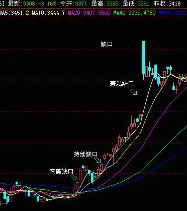 缺口又称裂口,是因开盘过高或过低造成的。 缺口分为突破缺口,持续缺口和衰竭缺口三种。突破缺口是市场选择方向后的第一个缺口,该缺口具有较强的指导意义,对未来行情有极强的支撑或阻力。持续缺口又称量度缺口,它通常在期价实现突破后进入下一个整区域时出现,具有加速期价上升或下降的作用,表明期价运行维持原有趋势。