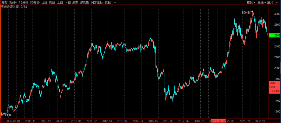 如上图,为玉米主力合约历史上的数据拼接周线图,可以看出当前品种历史上主要在1000~3000的价格区间波动。