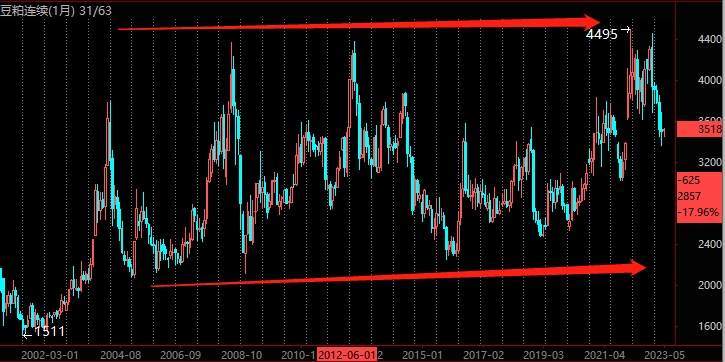从上图,可以看到在过去接近20年的月线走势中,豆粕的主力合约指数大体是在2000~4500元的区间波动,故而很容易让人认为长期来看豆粕走的是大震荡行情。