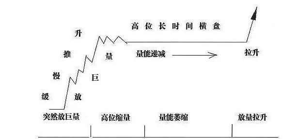 2、放巨量缓慢推高、高位横盘、直接拉升。