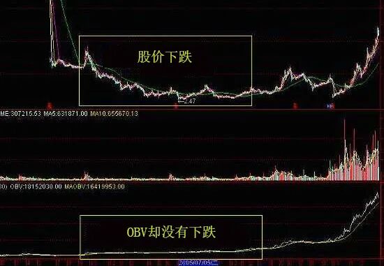 当OBV值能够有效向上爬升时,则表明主力收集阶段已经完成,OBV与股价顶背离时,上升趋势后劲不足,为“派发”阶段。OBV与股价底背离时,为“收集筹码”阶段。