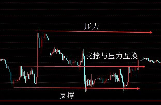 有时候支撑和压力是可以互换的,如中间的红线,一开始是压力,当K线突破后就可以变成支撑了。