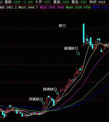 缺口又称裂口,是因开盘过高或过低造成的。缺口分为突破缺口,持续缺口和衰竭缺口三种。突破缺口是市场选择方向后的第一个缺口,该缺口具有较强的指导意义,对未来行情有极强的支撑或阻力。持续缺口又称量度缺口,它通常在期价实现突破后进入下一个整区域时出现,具有加速期价上升或下降的作用,表明期价运行维持原有趋势。