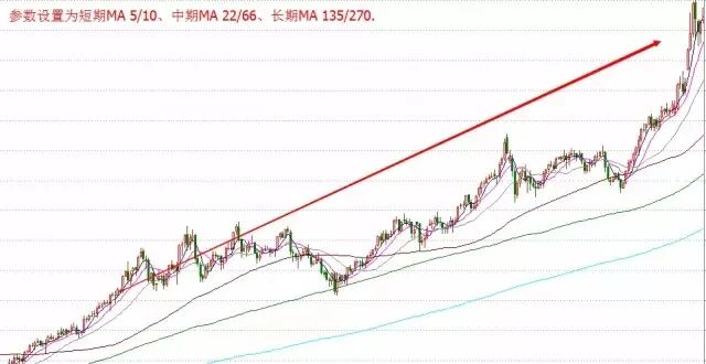 均线按照短中长依次向下排列并向上运行,称为多头排列(表明市场处于上升的趋势中,价格此时在均线上方受到均线支撑)。