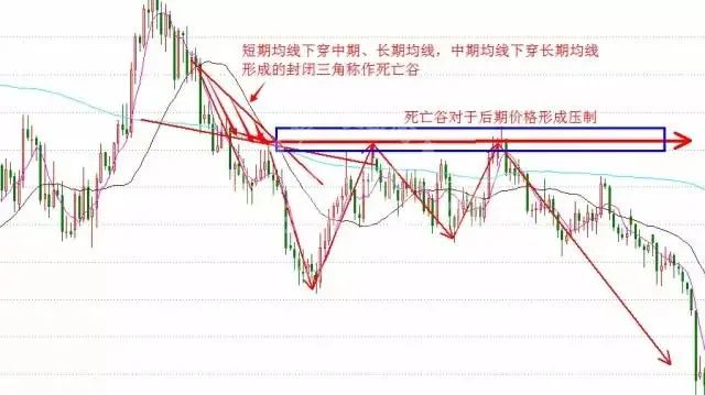 短期均线向下交叉中期、长期均线后,中期均线向下交叉长期均线,此时短中长期均线围成一个封闭的三角形,叫做死亡谷。