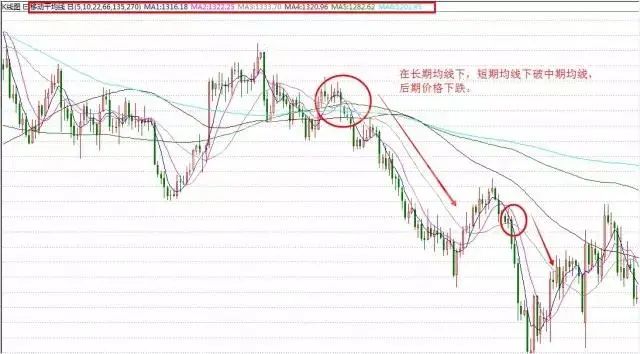 长期均线仍处于向下的趋势中,表明长期趋势未发生改变,当价格反抽时,短期均线常会与中期均线发生向上交叉,之后,短期均线在长期均线下方,再次与中期均线发生死叉,是卖出信号。此时说明价格的上涨是短暂的回调,已再次回归下跌趋势。