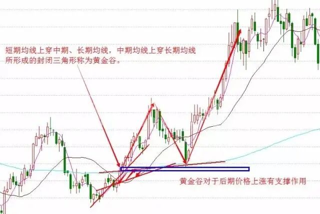 短期均线向上交叉中期、长期均线后,中期均线向上交叉长期均线,此时短中长期均线围成一个封闭的三角形,叫做黄金谷。