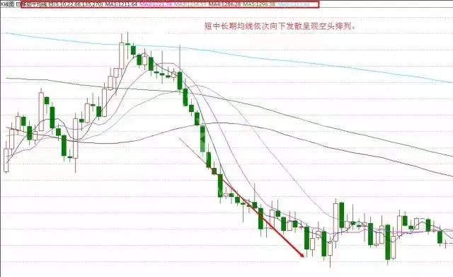 均线按照短中长依次向上排列并向下运行,称为空头排列(表明市场处于下降的趋势中,价格此时在均线下方受到均线阻力)
