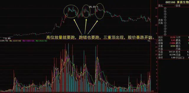 4、高位放量出现就要跑。股价在已经过了一段时间比较大的涨幅后,处在高位,而成交量还在增加,股价却迟迟没有上涨,表现出高位量增价平的现象,这有可能是主力在悄悄的出货了。