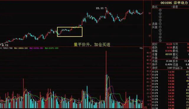 6、量平价升,加仓,可以理解为多空博弈,一旦量能出现快速放大的迹象,这就说明多头已经胜利,主力开始建仓入场了。