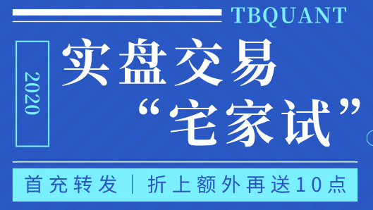 就能获得充值100TB点仅需78元的优惠(立即到账78点,首充成功赠送12点,完成TB“宅家试”首充转发,折上额外再送10点,所有赠点T+1日到账),开启您的TBQuant程序化实盘交易尝鲜之旅。