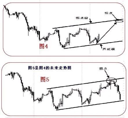 在下降趋势中,要想找到价位向下恢复下跌的理论目标(拐点),按照“要找下,先画上”的原则,首先在下降通道的上边找出通道的外延线,将外延线平移后得到拐点线,就可以确立下跌的理论拐点的位置(如下图)。