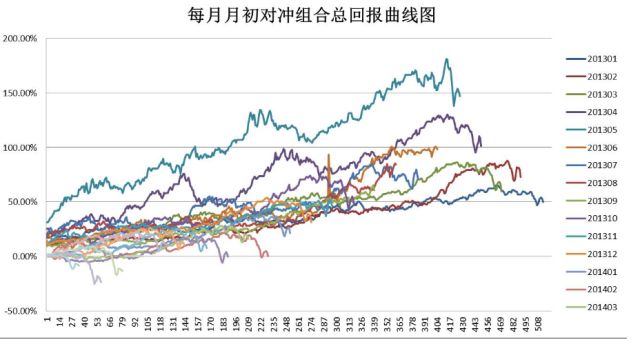▲图1 每月月初踩点对冲组合总回报曲线图(2013)