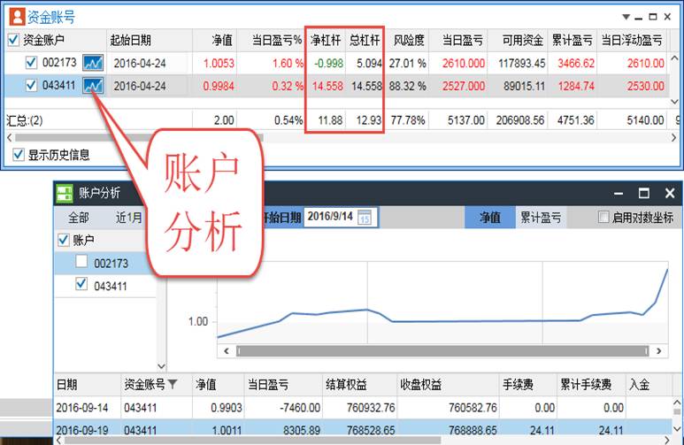 TB-Smart在账户查询界面直接做了账户分析的功能,实时查看账户的盈亏、净值等等。