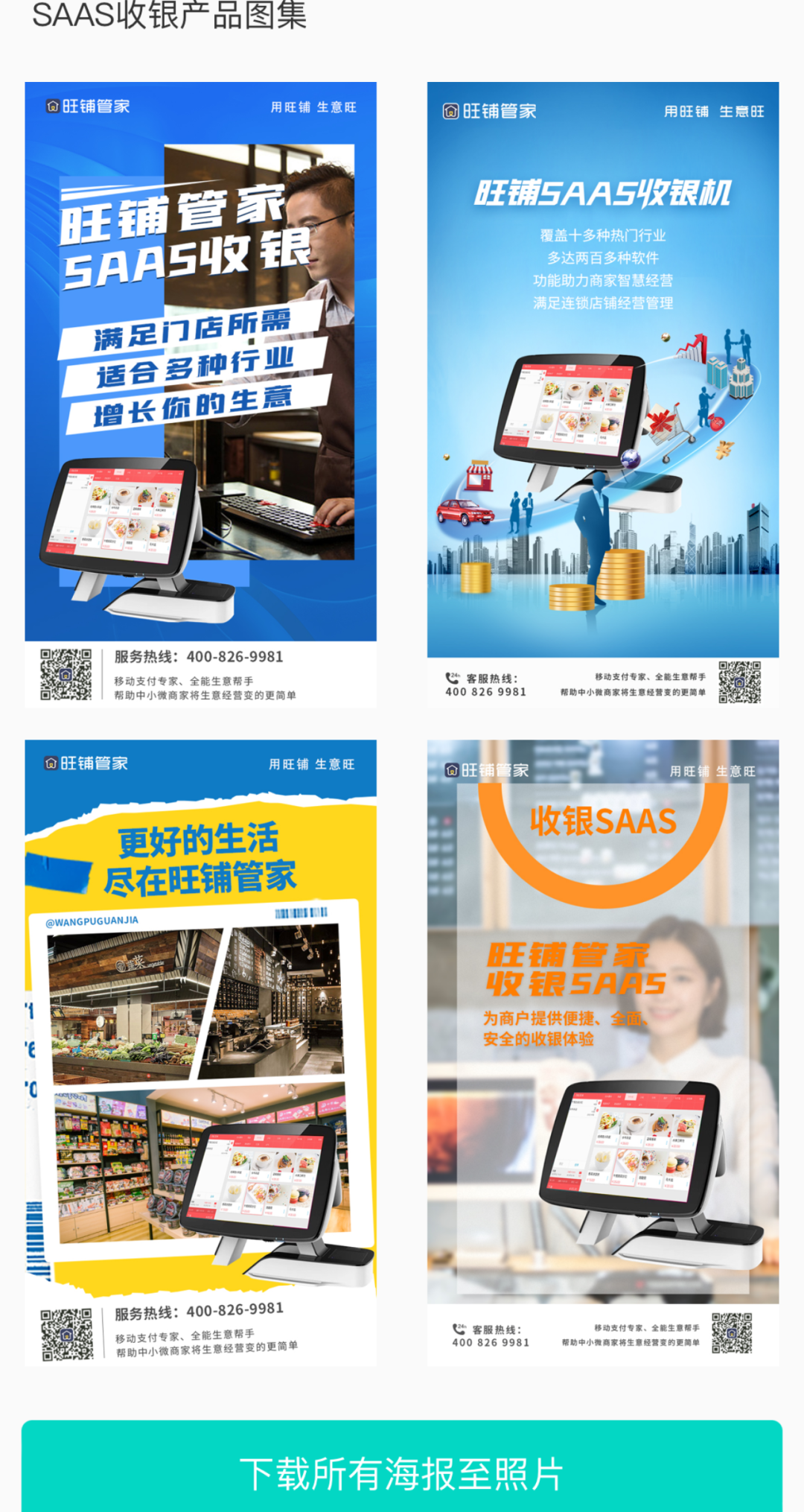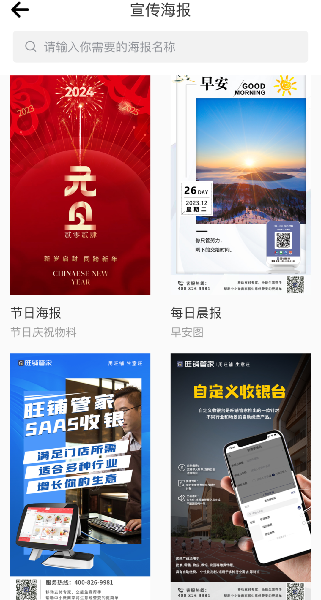 ✔点击进入板块即可浏览不同分类海报,涵盖旺铺管家所有产品、设备产品介绍海报,以及每日晨报和节日海报。