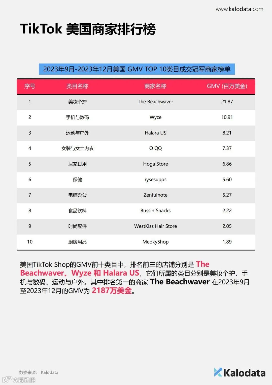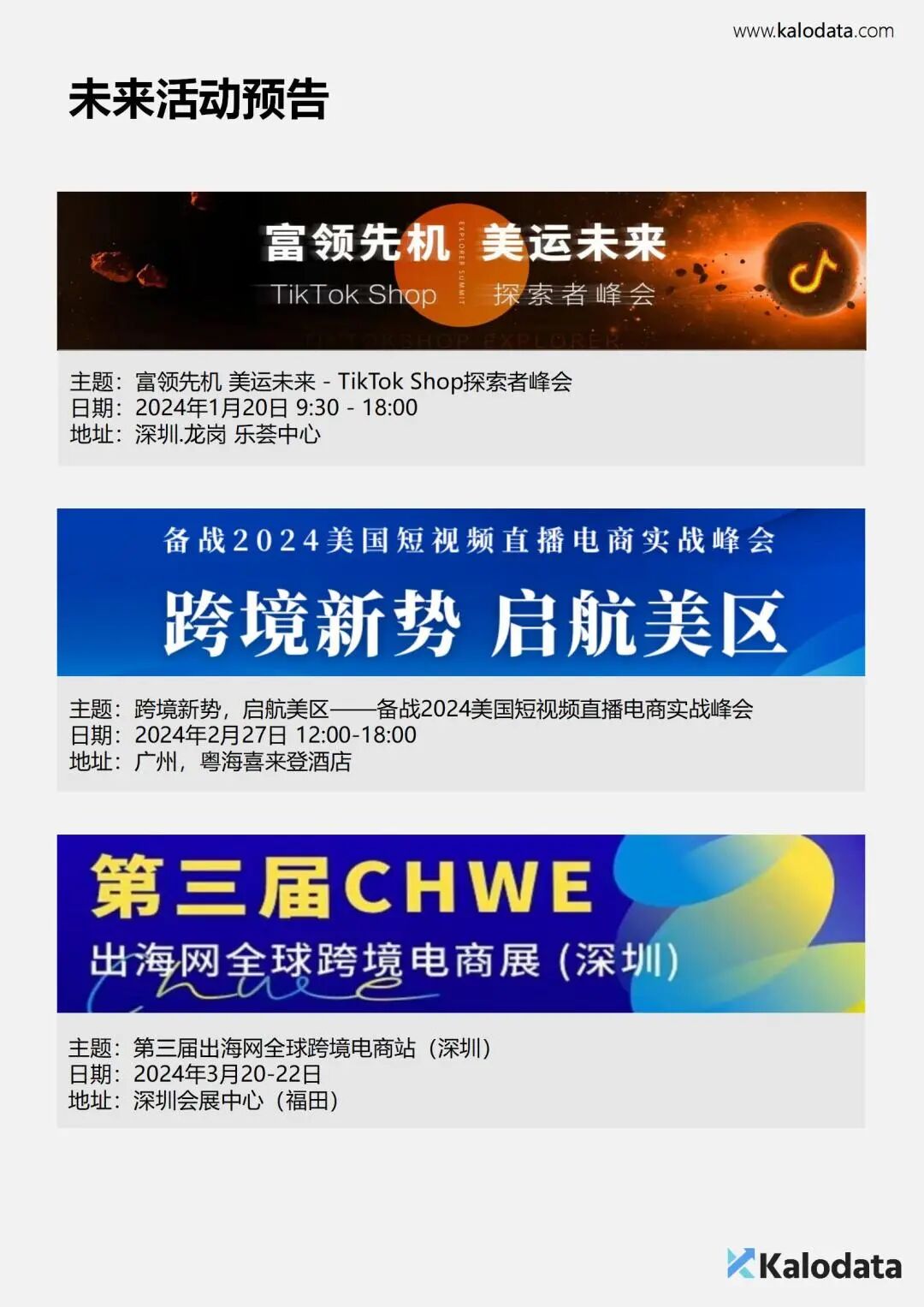 Kalodata作为全球领先的TikTok电商数据分析工具,联合业界头部媒体机构:36氪、TT123和跨境指南Cpsea,共同发布《2024年TikTok电商发展白皮书》。白皮书主要包含TikTok各国电商市场大盘数据,类目、店铺、商品、达人和内容榜单,以及TikTok电商经营策略等8部分内容,旨在揭析TikTok电商趋势,并为广大商家提供营销策略以在TikTok经营中获得成功。(全书共计129页)。
