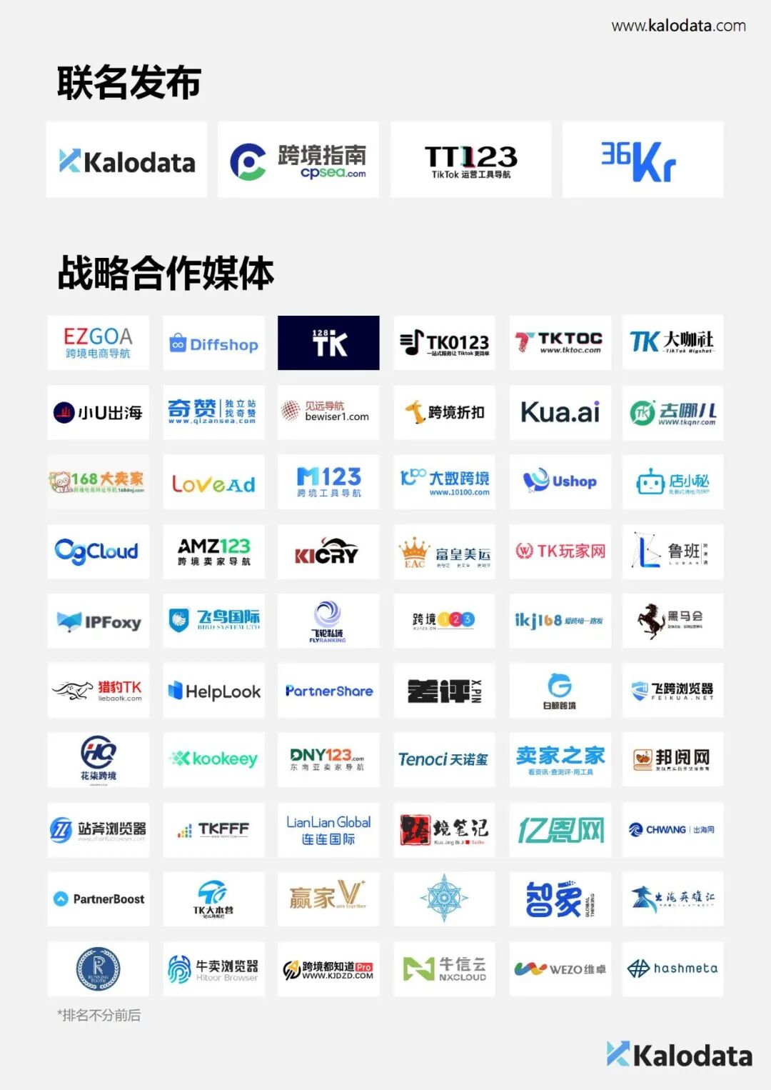 2024年TikTok电商发展白皮书由Kalodata联合36氪、TT123、跨境指南Cpsea共同发布!感谢以下合作伙伴对于本次白皮书的支持和宣传(排名不分先后)!