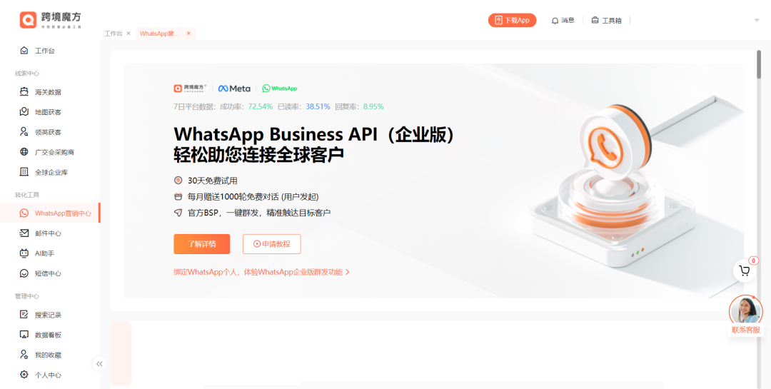 转化工具:跨境魔方不仅是WhatsApp官方BSP(现免费申请开通,还赠送每个月1000轮免费对话),无需翻墙,支持一键群发营销信息,更有邮件中心、短信中心等多种营销方式,操作简便,效果显著。