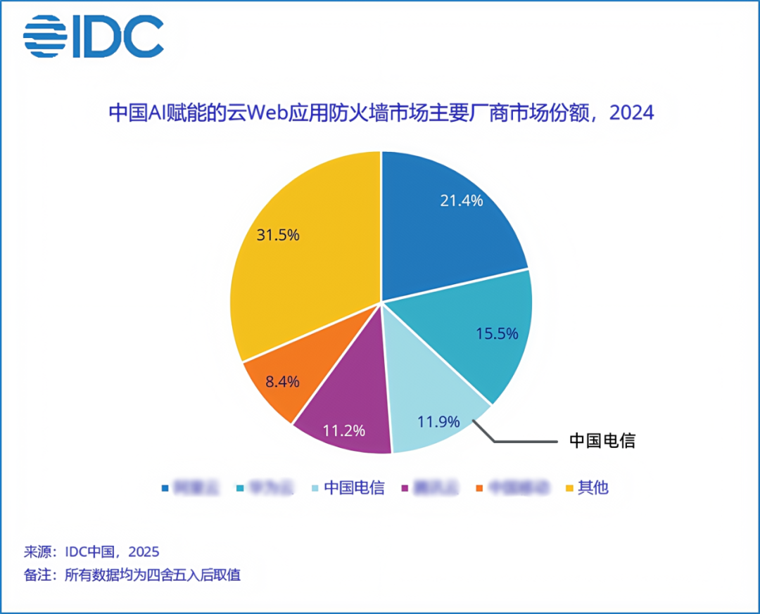 近日,国际权威咨询机构IDC发布《中国AI赋能的云Web应用防火墙市场份额,2024》报告,中国电信首次参评即以11.9%的份额跃居市场前三,以“云网融合”基因重塑Web安全防线。