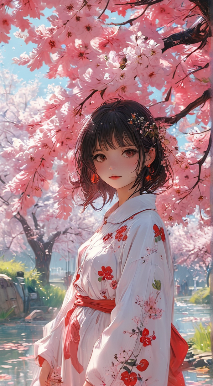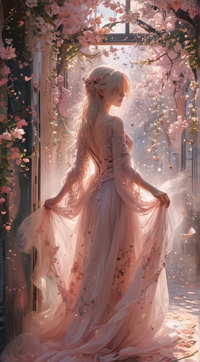 🎨DeepSeek提示词优化后:繁花簇拥的欧式庭院,身着浅粉色长裙的女性侧影,樱花花瓣随风飘落,阳光透过薄纱窗帘形成柔和光晕,背景点缀水晶质感蝴蝶。