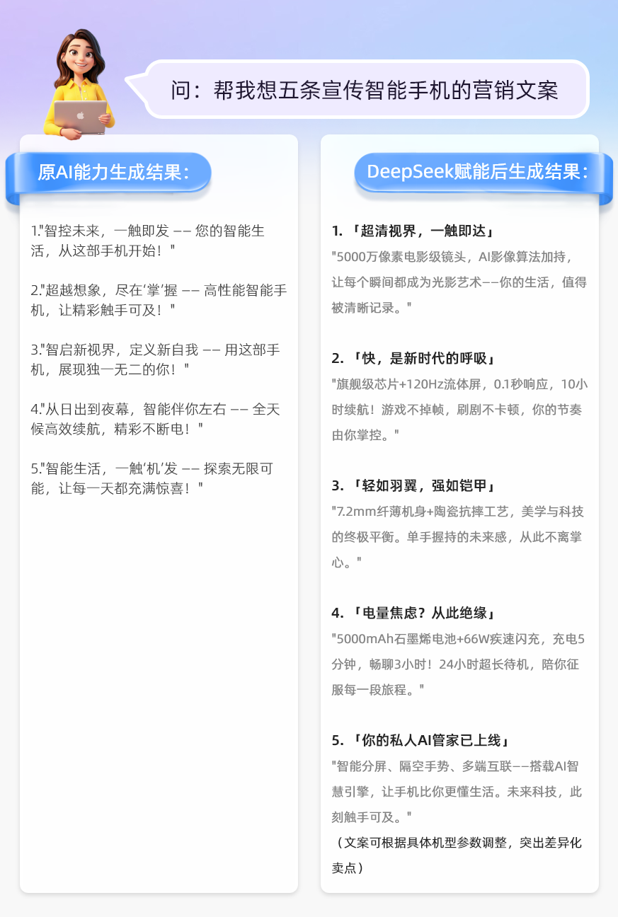 在DeepSeek的帮助下,天翼AI文创将推动实现创作逻辑可解释和风格进化可持续的突破。当AI能自动完成需求洞察、创意生成和设计呈现的全流程,让每一份想象力,都能找到通往商业价值的捷径!