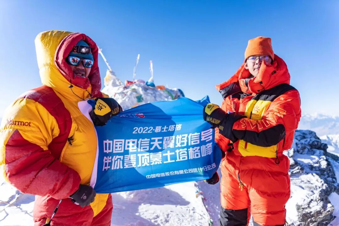 2022年7月1日7点26分,2022年慕士塔格峰登山大会第一批登山队员顺利登顶后,将印着“中国电信天翼好信号,伴你登顶慕士塔格峰”的蓝色旗帜插在慕士塔格峰顶。