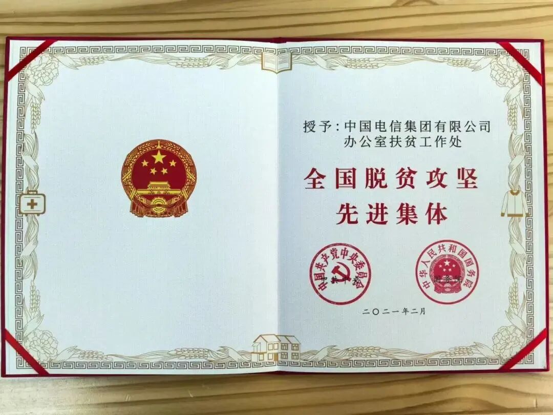 2021年,中国电信集团有限公司办公室扶贫工作处荣获全国脱贫攻坚先进集体。