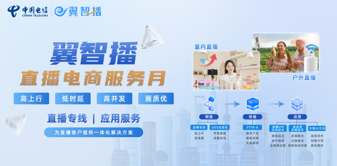 翼智播是中国电信专为直播行业打造的一站式解决方案,提供从内网优化、外网专属保障到直播平台赋能及智能增值服务的全链路支撑。其核心产品翼智播专线,提供高上行带宽、高等级QoS保障,确保直播高速稳定,更可叠加直播VIP加速、直播设备套件、天翼AI文创等增值业务,全方位提升直播画质、互动体验与运营效率。