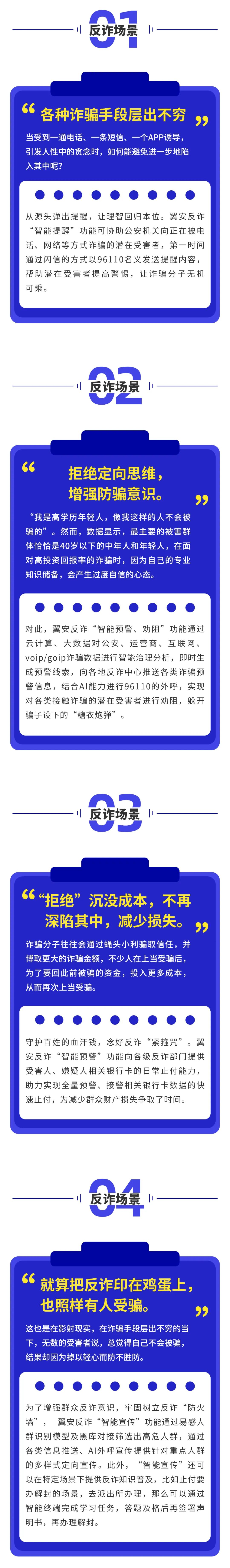 ,以电信云计算、大数据、人工智能、5G等技术为基石,在智能宣传、智能预警、智能拦截、智能分析、智能外呼(包括人工外呼、AI机器人外呼和短信劝阻)等层面实现功能安全与信息安全的深度融合,构建