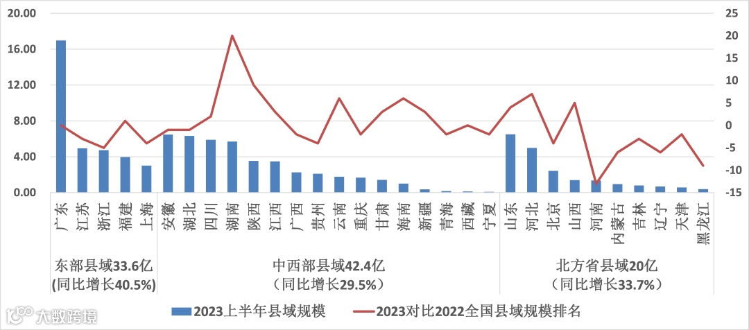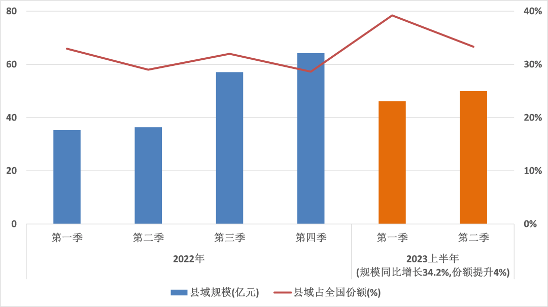 2023上半年县域数据能力建设项目规模(下文简称“县域规模”)96.1亿,同比增长34%,增速领先省市建设。项目份额从2022年的30.4%提升到2023上半年的34.2%,增加4pp(图1),县域数据能力建设加速。