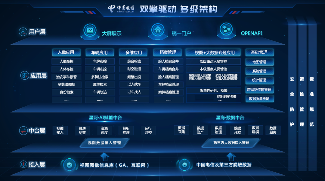 但是前端设备智能化程度低,大量治安监控未被智能化应用,现有应用平台的处理能力单一,人脸、车辆、视频结构化各自发展,缺乏融合应用等问题,一直让“科技警力”无法全面参与办案,行业急需一套可以建立感知-解析-聚档-多维数据深度融合的全智能应用体系。中国电信推出翼平安云脑·天元视图智能化应用平台,成功解决了这些问题。