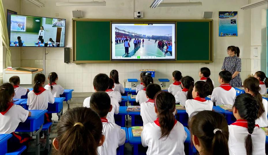 淄博市两所小学通过交互式在线教学系统同上一堂课。