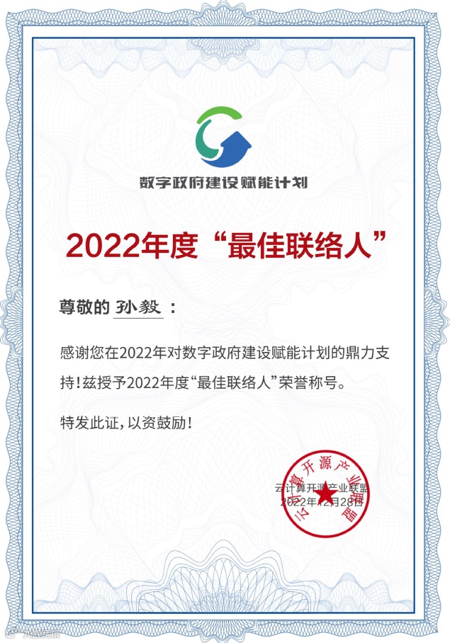 中国电信集团政务行业拓展部孙毅被评为2022年度数字政府建设赋能计划“最佳联络人”。