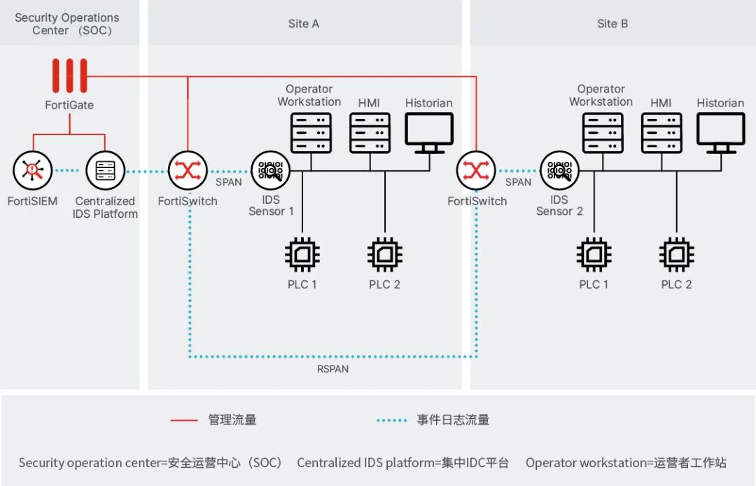 FortiSwitch支持SPAN(交换接口分析switched port analyzer和RSPAN(Remote Switched Port Analyzer 远程交换接口分析) 技术,Fortinet 合作伙伴工业 IDS 解决方案(如 Nozomi 、Claroty等)可以与 ICS/OT 网络中的 FortiSwitch 协同工作。