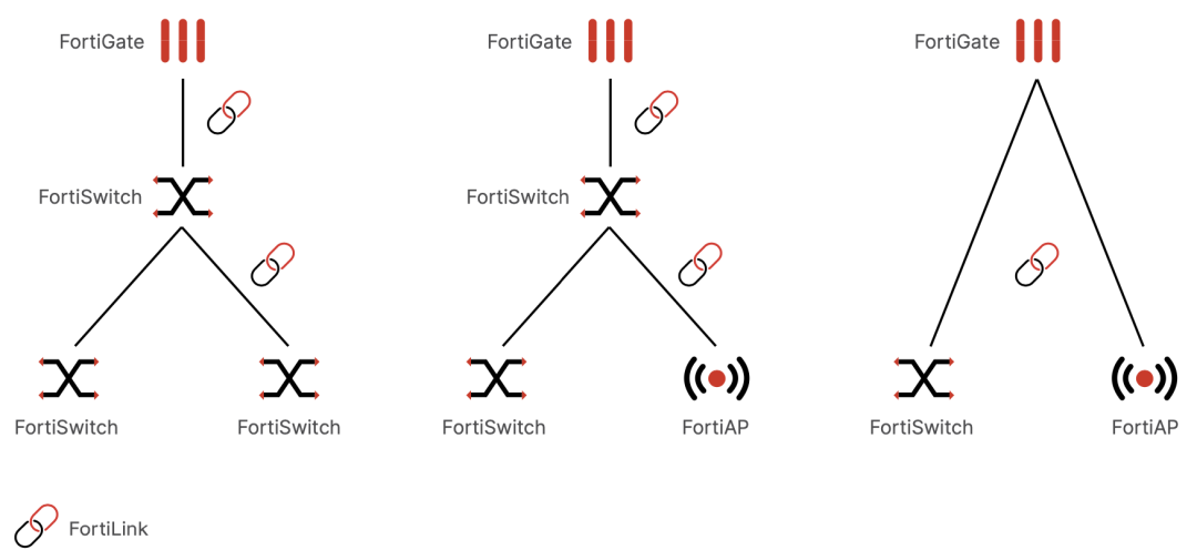 FortiLink 是Fortinet专有的管理协议,使FortiGate无缝管理任意FortiSwitch。FortiLink 协议允许用户将 FortiSwitch作为FortiGate 的一个逻辑延伸。FortiSwitch支持FortiLink协议,与FortiGate协同部署,可实现FortiSwitch交换机的自发现的零接触部署、集中式策略管理,并提供基本的网络访问控制(NAC)功能。相较多个单点产品部署,以FortiGate 防火墙为中心加交换的高度集成部署,更全面的威胁防护的同时拥有更低的成本优势。