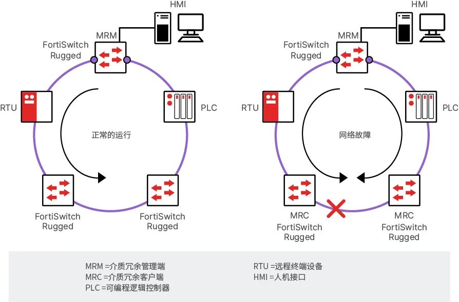 为了适应ICS/OT 网络的弹性且不间断的服务,提高网络可用性,在 ICS 内实施了冗余环网。基于此环网需要健壮且容错的网络冗余协议来最大限度地缩短恢复时间,并为处理控制网络 PCN(PCN:process control network / 工业控制系统 (ICS) 领域内的通信网络称为过程控制网络 (PCN)) 提供在完全或部分网络故障时更快恢复能力。国际标准 IEC 62439 指定了用于在工业和自动化网络中实施和维护高可用性的网络协议。为了满足 ICS/OT 网络的高可用性和弹性要求,FortiSwitch Rugged 系列交换机支持 IEC 62439-2介质冗余协议 (MRP:Media Redundancy Protocol) 和基于 MRP 的环网实施。
