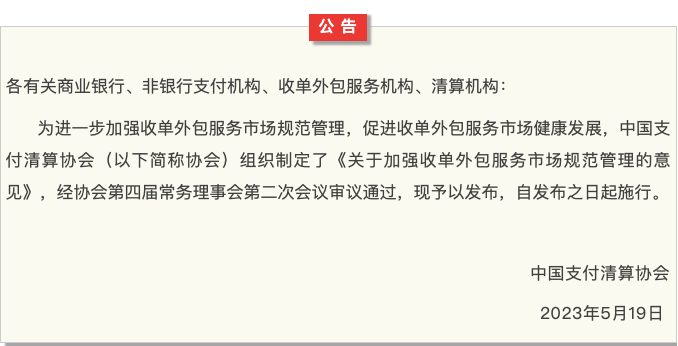 近日,中国支付清算协会印发《关于加强收单外包服务市场规范管理的意见》(以下简称《意见》),旨在进一步加强收单外包服务市场规范管理,促进收单外包服务市场健康发展。