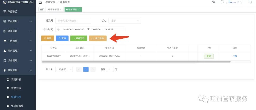 1、商家登录旺铺管家PC端,进入【教培管理】—【账单列表】,点击【模板下载】,下载可填写缴费信息的表格。