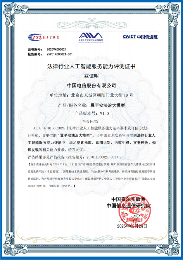 2025年3月,中国信息通信研究院(以下简称“中国信通院”)完成了第一轮法律行业人工智能服务能力评测工作。中国电信股份有限公司(以下简称“中国电信”)的翼平安法治大模型(V1.0)首批顺利通过“法律行业人工智能服务能力基本要求及评估方法”规范检验。