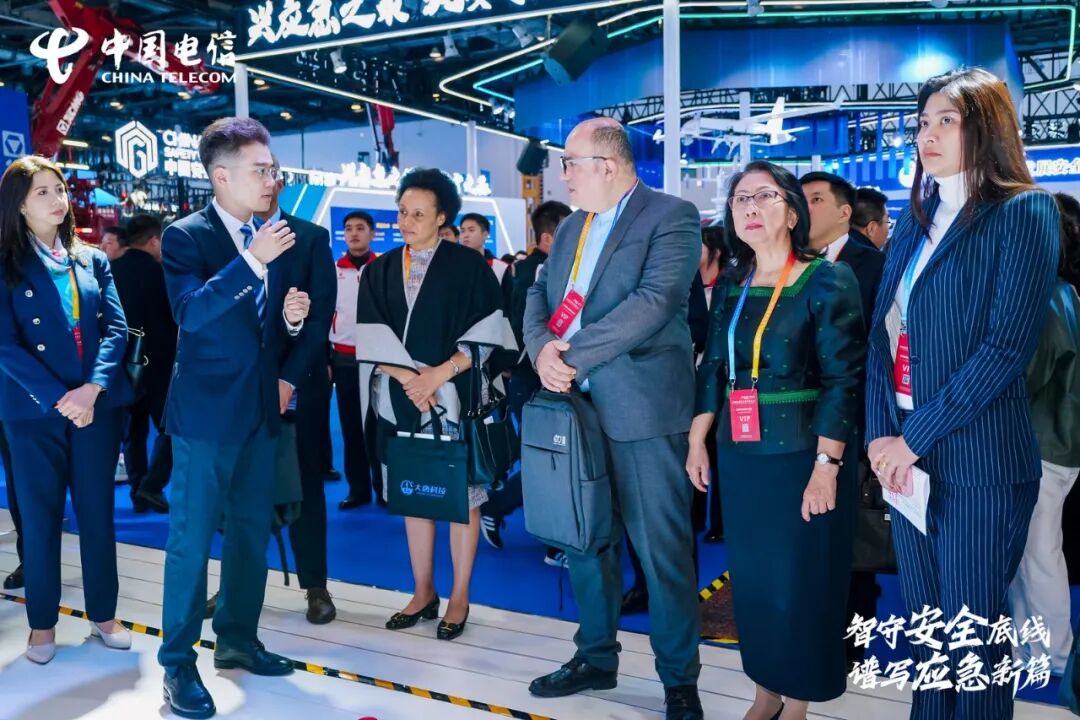 现场工作人员为“一带一路”沿线多国驻华使节讲解了中国电信积极贯彻国家应急战略,在应急指挥调度、卫星通信和人工智能大模型等方面做出的发展建设,助力应急管理智能化高质量发展,推进防灾减灾救灾国际交流合作,践行央企担当。