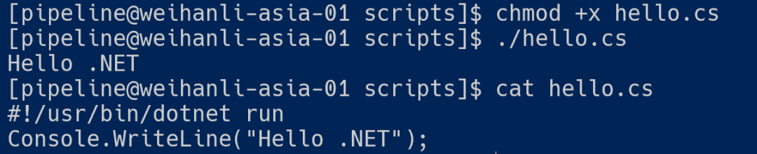 支持 Linux/Unix 下的 shebang(#!),我们可以让 C# 脚本像 Bash/Python 一样直接运行,可以执行 ./hello.cs
