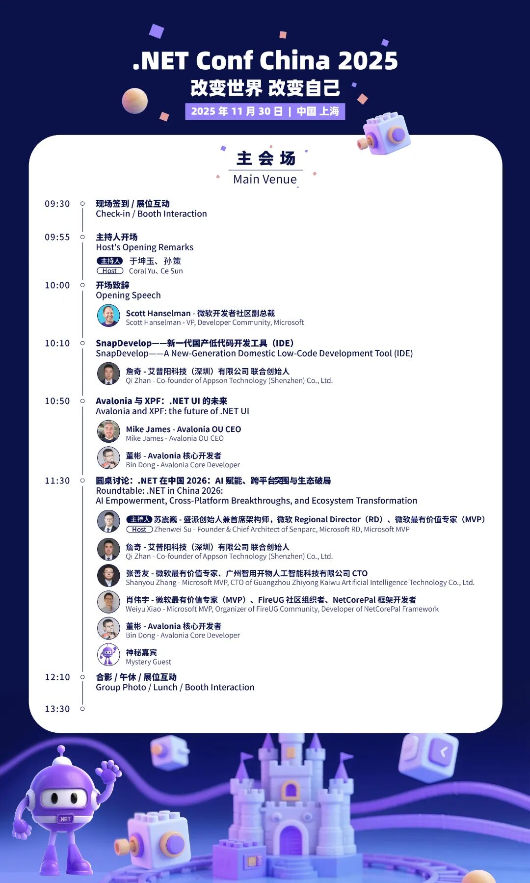 我们诚挚邀请全国的 .NET 开发者、技术爱好者到场,一起探索性能跃升、AI 融合与跨平台创新的无限可能,共同见证 .NET 技术生态的最新进展与未来方向。