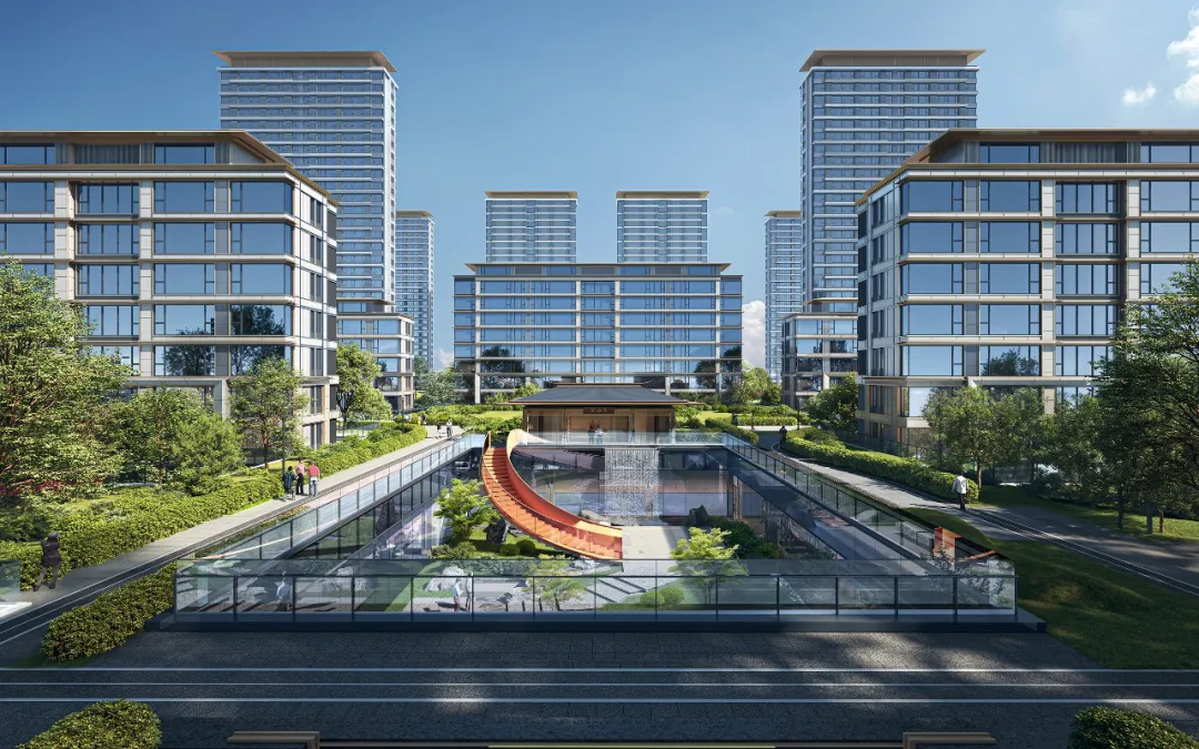 架空平台下,结合下沉庭院、打造奢隐的私家社区生活组团,融合山川河岳的东方园林与私家会所空间,形成生态自然的社区活动空间。