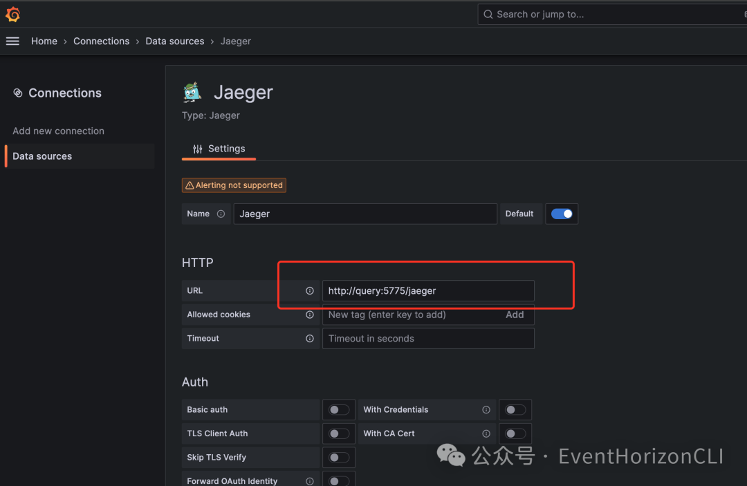 配置 Jaeger 数据源的 URL 为 http://query:5775/jaeger。